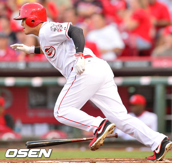 7일 (이하 한국시간) 미국 오하이오주 신시내티 그레이트 아메리칸 볼파크에서 열린 2013 메이저리그 신시내티 레즈와 LA 다저스의 경기에서 1회말 선두타자 추신수가 2루수 땅볼 타구를 날린 후 1루로 달려나가고 있다.