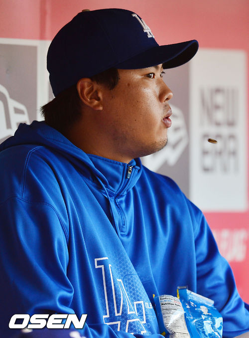 7일 (이하 한국시간) 미국 오하이오주 신시내티 그레이트 아메리칸 볼파크에서 열린 2013 메이저리그 신시내티 레즈와 LA 다저스의 경기, 다저스 덕아웃에서 류현진이 해바기씨 껍질을 뱉어내며 해바라기씨를 먹고 있다.
