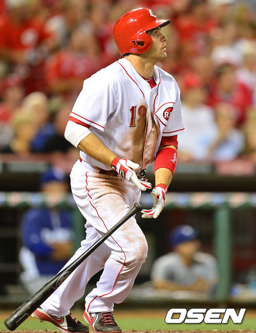 7일 (이하 한국시간) 미국 오하이오주 신시내티 그레이트 아메리칸 볼파크에서 열린 2013 메이저리그 신시내티 레즈와 LA 다저스의 경기에서 5회말 2사 주자 2루 신시내티의 조이 보토가 좌월 역전 투런 홈런을 날리고 있다.