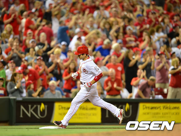 7일 (이하 한국시간) 미국 오하이오주 신시내티 그레이트 아메리칸 볼파크에서 열린 2013 메이저리그 신시내티 레즈와 LA 다저스의 경기에서 5회말 2사 주자 2루 신시내티의 조이 보토가 좌월 역전 투런 홈런을 날린 후 그라운드를 돌고 있다.