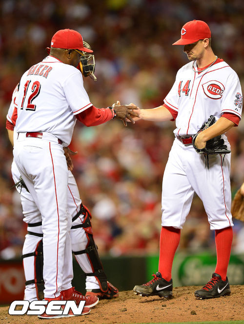 7일 (이하 한국시간) 미국 오하이오주 신시내티 그레이트 아메리칸 볼파크에서 열린 2013 메이저리그 신시내티 레즈와 LA 다저스의 경기에서 8회초 2사 주자 1루 다저스 크로포드 타석에서 신시내티 선발 마이크 리크가 교체되고 있다.