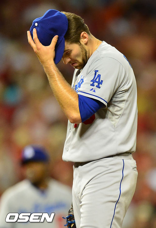 7일 (이하 한국시간) 미국 오하이오주 신시내티 그레이트 아메리칸 볼파크에서 열린 2013 메이저리그 신시내티 레즈와 LA 다저스의 경기에서 8회말 마운드에 오른 다저스 로드리게스가 무사 만루 위기를 만들고 아쉬워하고 있다.