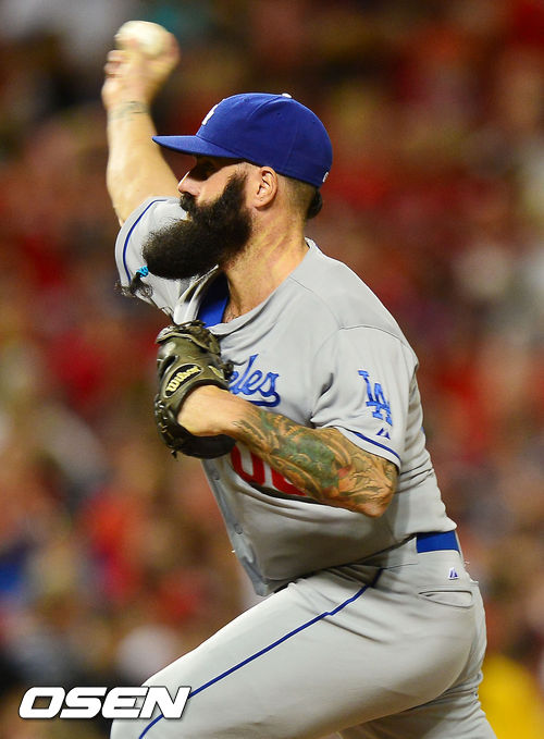 7일 (이하 한국시간) 미국 오하이오주 신시내티 그레이트 아메리칸 볼파크에서 열린 2013 메이저리그 신시내티 레즈와 LA 다저스의 경기에서 8회말 무사 주자 만루 위기에 마운드에 오른 윌슨이 힘차게 공을 뿌리고 있다.