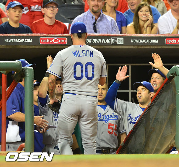 8회말 무사 주자 만루 위기에 마운드에 오른 윌슨이 무실점으로 막아낸 후 덕아웃에서 동료들의 환호를 받고 있다./ rumi@osen.co.kr