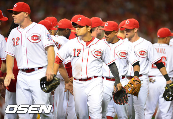 경기를 마치고 신시내티 추신수가 동료들과 하이파이브를 하고 있다. / rumi@osen.co.kr