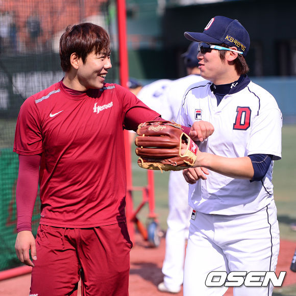 7일 오후 서울 목동구장에서 열린 '2013 한국야쿠르트 세븐 프로야구' 넥센 히어로즈와 두산 베어스의 경기에 앞서 두산 이원석과 넥센 강정호가 장난을 치고 있다.