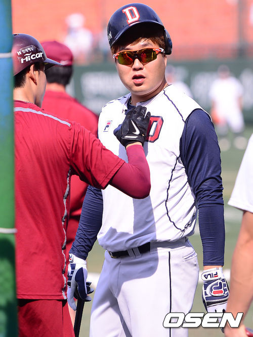 7일 오후 서울 목동구장에서 열린 '2013 한국야쿠르트 세븐 프로야구' 넥센 히어로즈와 두산 베어스의 경기에 앞서 두산 양의지가 훈련에 나서고 있다.