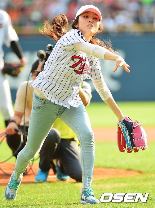 가수 이수영이 시구자로 나서 힘차게 공을 던지고 있다.