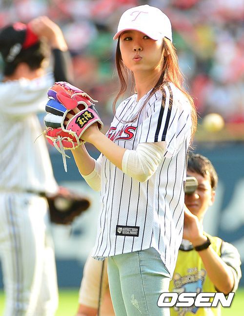 가수 이수영이 시구자로 나서 공을 던질 준비를 하고 있다.