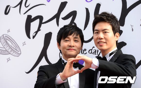 결혼식에 앞서 김조광수 감독과 김승환씨가 기자회견을 하며 포즈를 취하고 있다.