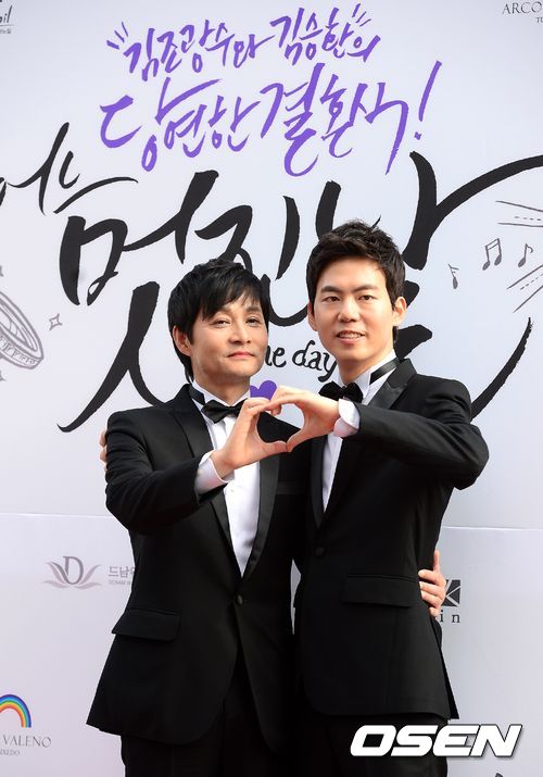결혼식에 앞서 김조광수 감독과 김승환씨가 기자회견을 하며 포즈를 취하고 있다.