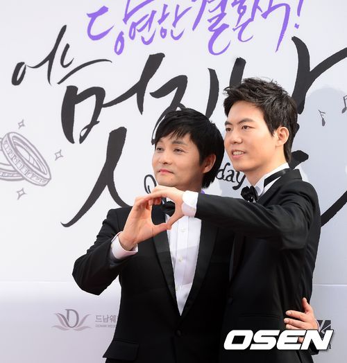 결혼식에 앞서 김조광수 감독과 김승환씨가 기자회견을 하며 포즈를 취하고 있다.