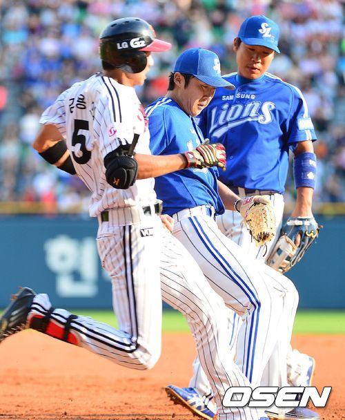 1회말 LG 공격 1사 주자없는 상황 2번 김용의의 내야 땅볼 때 삼성 선발 배영수가 1루수의 토스를 받아 1루를 밟으며 타자주자를 아웃시키고 있다.