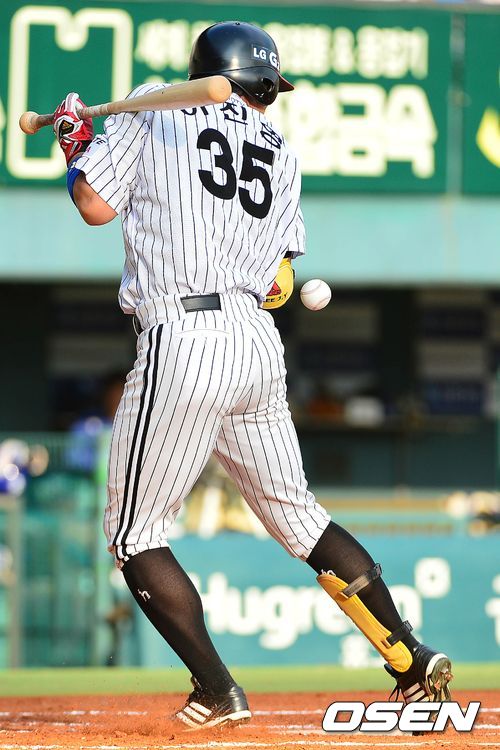 1회말 LG 공격 2사 주자없는 상황 3번 이진영이 삼성 선발 배영수의 투구에 몸을 맞고 있다.