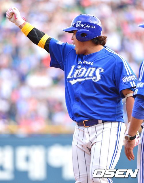 3회초 삼성 공격 2사 만루상황 5번 박석민이 2타점 좌전안타를 날리고 1루에 안착한 뒤 환호하고 있다.