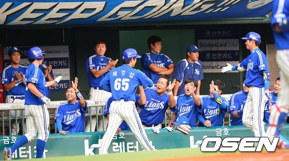 3회초 삼성 공격 2사 만루상황 5번 박석민의 2타점 좌전안타 때 득점에 성공한 삼성 배영섭과 정형식이 더그아웃 동료들과 인사를 나누고 있다.