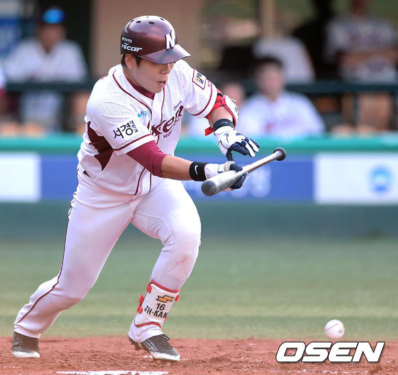 7일 오후 서울 목동구장에서 열린 '2013 한국야쿠르트 세븐 프로야구' 넥센 히어로즈와 두산 베어스의 경기, 2회말 무사 2루 넥센 강정호가 번트안타를 성공하고 있다.
