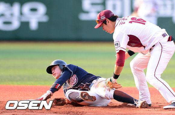 7일 오후 서울 목동구장에서 열린 '2013 한국야쿠르트 세븐 프로야구' 넥센 히어로즈와 두산 베어스의 경기, 2회초 1사 1루 두산 양의지의 타석때 1루 주자 김동한이 도루 성공하고 있다.