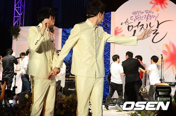 결혼식 도중 한 시민이 무대에 올라 오물을 투척하자 김조광수 감독과 김승환 대표가 하객들을 진정시키고 있다.