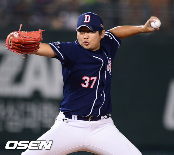 7일 오후 서울 목동구장에서 열린 '2013 한국야쿠르트 세븐 프로야구' 넥센 히어로즈와 두산 베어스의 경기, 8회말 두산 원용묵 투수가 역투하고 있다