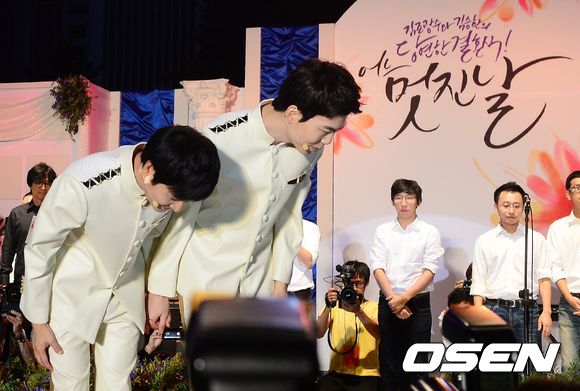 김조광수 감독과 김승환 대표가 결혼식을 올리며 하객에게 인사를 하고 있다.