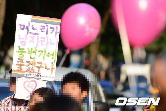 결혼식에 앞서 동성애자인권연대 관계자가 '며느리가 남자라니 농번기에 좋겠구나' 피켓을 들고 있다.
