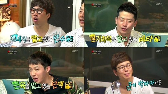 7일 오후 방송된 KBS 2TV 예능프로그램 '인간의 조건'에서는 개그맨 박성호, 김준호, 허경환, 정태호 등ㅇ이 5대 영양소에 맞춘 식사를 하기 위해서 노력하는 모습이 그려졌다.