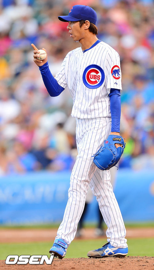 8일 (이하 한국시간) 미국 일리노이주 시카고 리글리 필드에서 열린 2013 메이저리그 시카고 컵스와 밀워키 브루어스의 경기,7회 1사에 마운드에 오른 시카고 컵스 임창용이 사인을 보내고 있다.