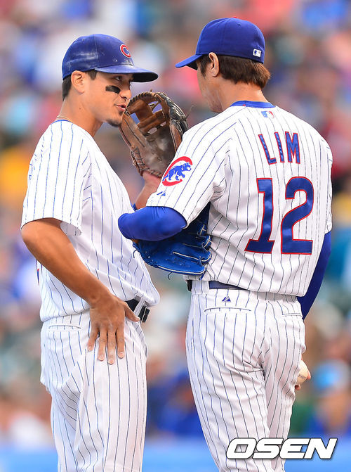 8일 (이하 한국시간) 미국 일리노이주 시카고 리글리 필드에서 열린 2013 메이저리그 시카고 컵스와 밀워키 브루어스의 경기,7회 1사에 마운드에 오른 시카고 컵스 임창용이 한국계 선수 다윈 바니와 얘기를 나누고 있다.