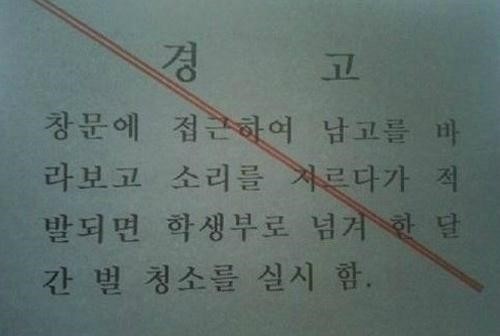 "바깥은 혼자 돌아다니기엔 위험하단다! 이 아이들 중 하나를 데려가렴"이라는 글귀와 함께 포켓몬스터에 나오는 꼬부기, 파이리 등의 캐릭터를 떼어갈 수 있도록 만들었던 학교 엘리베이터 경고문 1탄과는 사뭇 다른 느낌이다. 하지만 '피끓는' 여고생들을 단속하기 위한 엄한 경고문의 내용은 1탄과 마찬가지로 재치만점 웃음을 자아낸다.