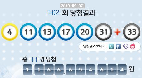7일 추첨한 결과, 로또 제 562회 1등 당첨번호는 '4, 11, 13, 17, 20, 31'로 결정됐다. 로또 2등 보너스 번호는 '33'이다.