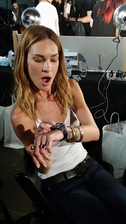 사진 속에서 알렉산더 왕 패션쇼의 피날레를 장식한 슈퍼모델 에린 왓슨(Erin Wasson)이 패션쇼를 준비하는 동안 ‘갤럭시 기어’를 사용하며 즐거워하고 있다.