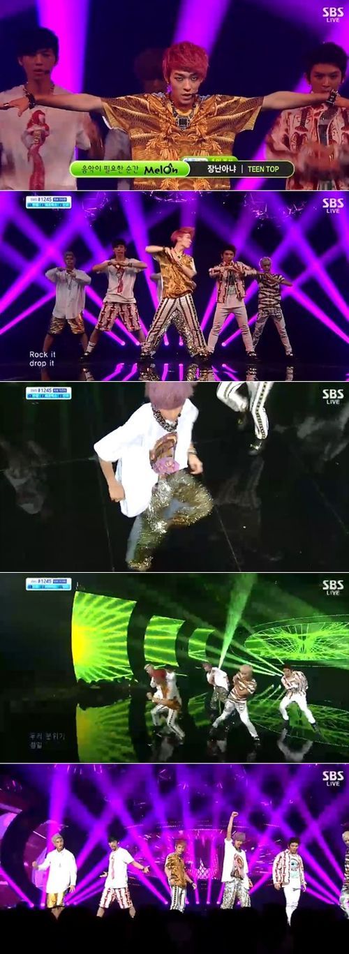 틴탑은 8일 오후 방송된 SBS '인기가요'에서 1위 후보에 오른 '장난아냐'를 선보였다.