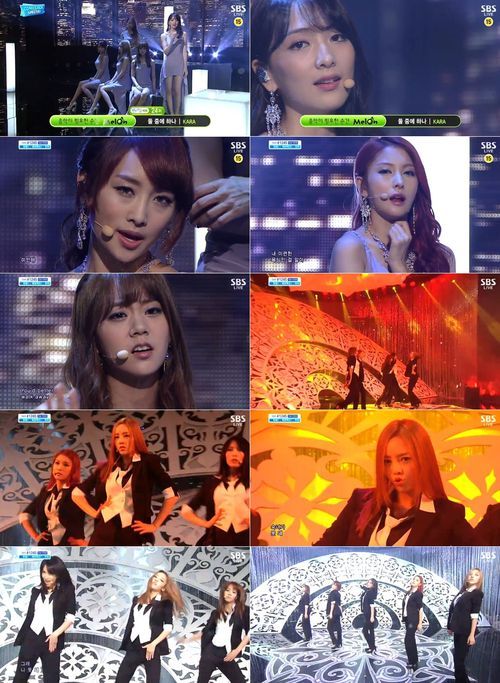 카라는 8일 방송된 SBS '인기가요'에서 지난 2일 발표한 네 번째 정규앨범 '풀블룸'의 선공개곡 '둘중에 하나', 타이틀곡 '숙녀가 못돼' 무대를 연이어 선보였다.