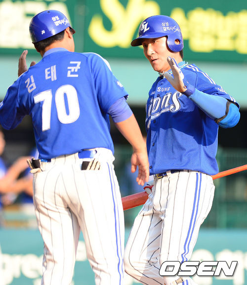 8일 오후 서울 잠실구장에서 열린 '2013 한국야쿠르트 세븐 프로야구' LG 트윈스와 삼성 라이온즈의 경기, 1회초 삼성 선두타자 배영섭이 선취 솔로홈런을 날리고 김태군 코치와 하이파이브를 하고 있다