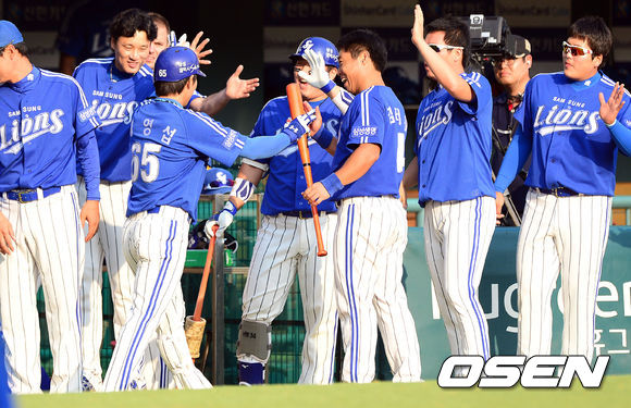 8일 오후 서울 잠실구장에서 열린 '2013 한국야쿠르트 세븐 프로야구' LG 트윈스와 삼성 라이온즈의 경기, 1회초 삼성 선두타자 배영섭이 선취 솔로홈런을 날리고 동료들의 축하를 받고 있다