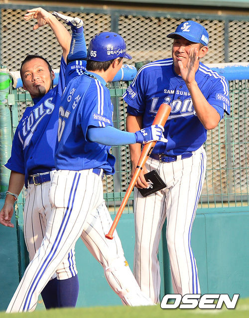 8일 오후 서울 잠실구장에서 열린 '2013 한국야쿠르트 세븐 프로야구' LG 트윈스와 삼성 라이온즈의 경기, 1회초 삼성 선두타자 배영섭이 선취 솔로홈런을 날리고 카도쿠라 인스트럭터와 하이파이브를 하고 있다
