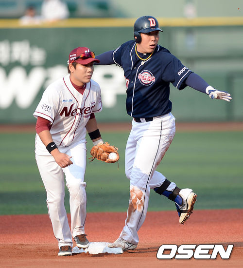 8일 오후 서울 목동야구장에서 열린 2013 한국야쿠르트 세븐프로야구 넥센 히어로즈와 두산 베어스의 경기, 1회초 2사에서 두산 김현수가 중전 안타를 치고 2루로 쇄도하며 심판의 판정을 기다리고 있다.