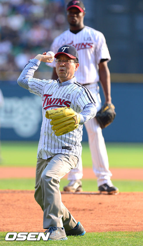 8일 오후 서울 잠실구장에서 열린 '2013 한국야쿠르트 세븐 프로야구' LG 트윈스와 삼성 라이온즈의 경기에 앞서 박원순 서울시장이 시구를 하고 있다