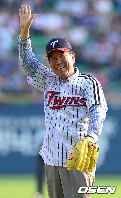 8일 오후 서울 잠실구장에서 열린 '2013 한국야쿠르트 세븐 프로야구' LG 트윈스와 삼성 라이온즈의 경기에 앞서 박원순 서울시장이 시구를 마친후 팬들에게 인사를 하고 있다