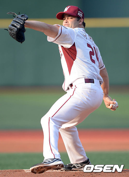 8일 오후 서울 목동야구장에서 열린 2013 한국야쿠르트 세븐프로야구 넥센 히어로즈와 두산 베어스의 경기, 1회초 무사에서 넥센 나이트가 힘차게 공을 던지고 있다.