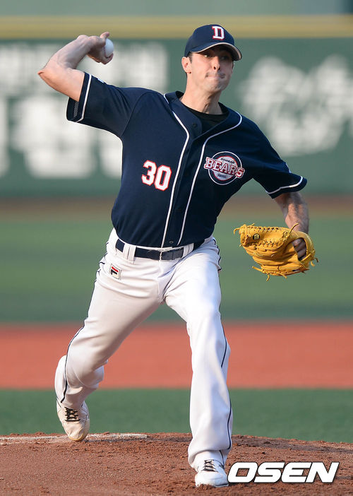 8일 오후 서울 목동야구장에서 열린 2013 한국야쿠르트 세븐프로야구 넥센 히어로즈와 두산 베어스의 경기, 1회말 무사에서 두산 핸킨스가 힘차게 공을 던지고 있다.