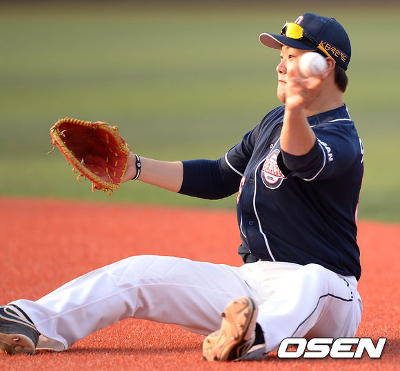 8일 오후 서울 목동야구장에서 열린 2013 한국야쿠르트 세븐프로야구 넥센 히어로즈와 두산 베어스의 경기, 2회말 1사에서 두산 오재일이 넥센 김민성의 땅볼 타구를 잡아 1루로 송구하고 있다.