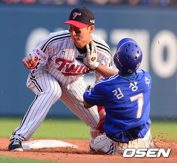 8일 오후 서울 잠실구장에서 열린 '2013 한국야쿠르트 세븐 프로야구' LG 트윈스와 삼성 라이온즈의 경기, 3회초 1사 1루 삼성 배영섭의 타석때 도루 시도한 1루 주자 김상수가 LG 손주인 2루수에게 태그아웃되고 있다