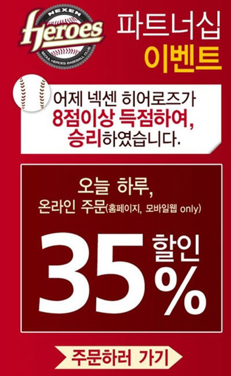 이번 할인행사는 프로야구 넥센과의 제휴 이벤트로 9~10월 넥센과 벌어지는 프로야구 경기에서 넥센이 승리하면 할인을 해주는 이벤트 행사이다.