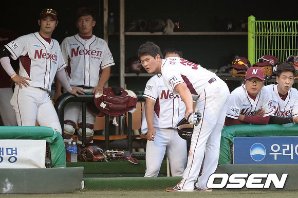 8일 오후 서울 목동야구장에서 열린 2013 한국야쿠르트 세븐프로야구 넥센 히어로즈와 두산 베어스의 경기, 3회말 1사 1루에서 넥센 허도환의 내야 안타 때 포스아웃 처리된 1루주자 이성열이 덕아웃에서 아쉬운 표정을 그라운드를 바라보고 있다.