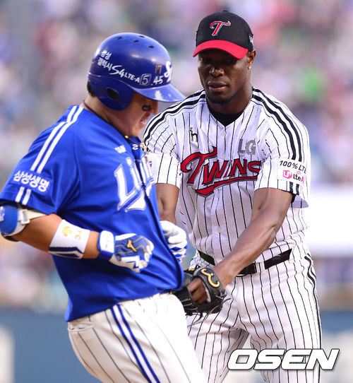 8일 오후 서울 잠실구장에서 열린 '2013 한국야쿠르트 세븐 프로야구' LG 트윈스와 삼성 라이온즈의 경기, 4회초 2사 삼성 최형우의 내야땅볼때 LG 리즈 선발투수가 타자를 태그아웃시키고 있다
