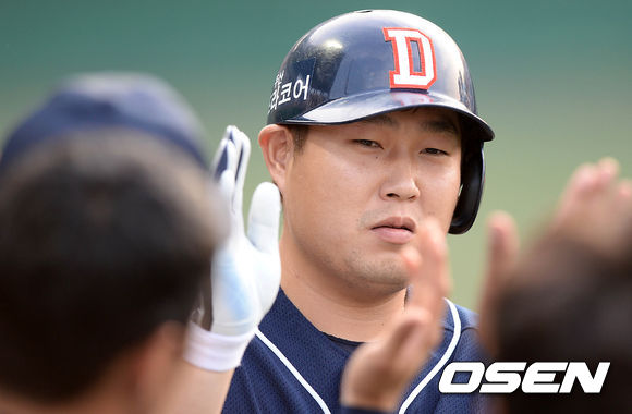 8일 오후 서울 목동야구장에서 열린 2013 한국야쿠르트 세븐프로야구 넥센 히어로즈와 두산 베어스의 경기, 4회초 2사 1루에서 두산 양의지가 중월 투런 홈런을 치고 덕아웃에서 동료들의 축하를 받고 있다.