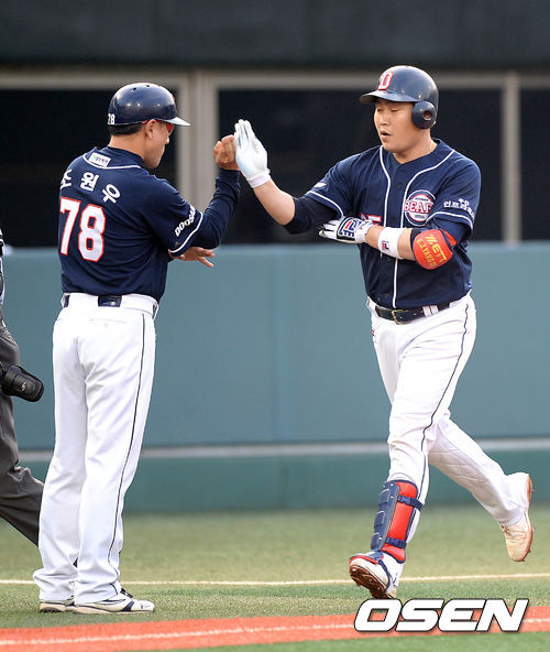 8일 오후 서울 목동야구장에서 열린 2013 한국야쿠르트 세븐프로야구 넥센 히어로즈와 두산 베어스의 경기, 4회초 2사 1루에서 두산 양의지가 중월 투런 홈런을 치고 조원우 코치와 하이파이브를 하고 있다.
