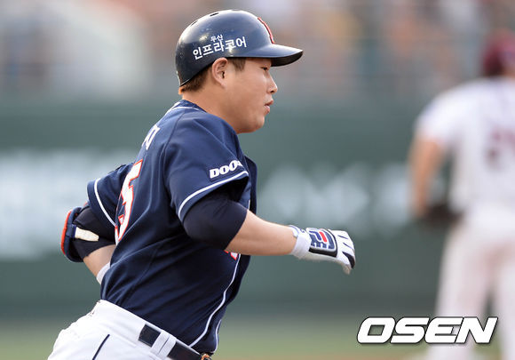 8일 오후 서울 목동야구장에서 열린 2013 한국야쿠르트 세븐프로야구 넥센 히어로즈와 두산 베어스의 경기, 4회초 2사 1루에서 두산 양의지가 중월 투런 홈런을 치고 그라운드를 돌고 있다.